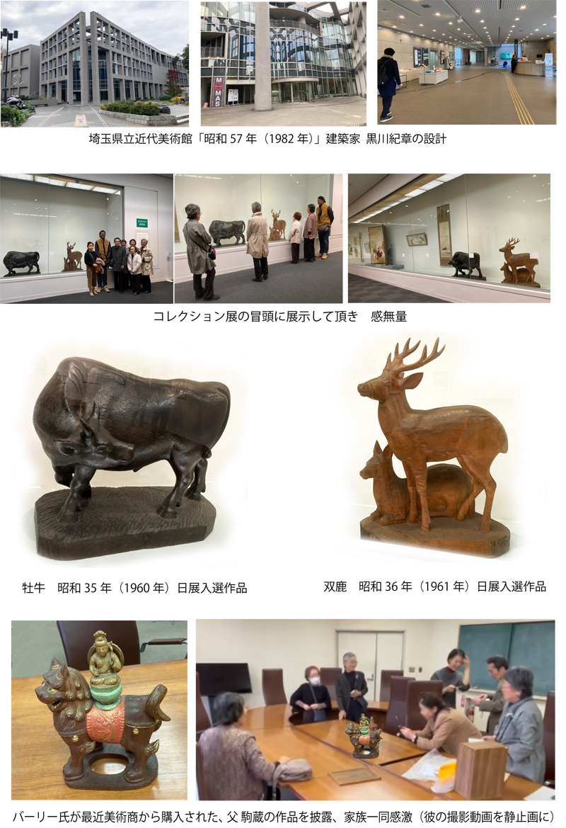 ![]() 当店は、予約制でお願いしております。ご理解の程願い致します ![]() 11月11日 埼玉県立近代美術館コレクション展へ総勢7名で行く(9月6日~11月30日まで) アフリカ ギニヤのバーリーユースフ氏(美術コレクター)と私の親族、6名でのコレクション展、観賞会になりました。 広い展示室の入り口付近の一等席に、父故 大島駒蔵の2作品が展示されており、彫刻はこの2点のみで実に素晴らしく目を引きました。50年以上前に我が家で見た作品とは、別ものの輝きです。 バーリー氏と一緒に観賞して廻ったのですが、彼と私は先月から、電話で何回かやり取りをして気さくな方だとは思っていたものの、外国の方とお会いするのは始めての事で多少の心配はありました。 処が彼は、全く違和感を抱かせることなく、すぐに皆と打ち解けてしまいました。 正に地球は一つを感じて明るい気持ちになりました。 館内のイタリアンレストランを予約していたのですが1時間の予定がギニヤの風習など、話が盛り上がって30分も楽しく超過したのには驚きました。やはり30才過ぎまで過ごした祖国を出て異国での30年間には、言葉の問題もあり苦労も多かった事でしょうが、持ち前の明るい人柄で乗り越えてこられたのだと思います。 その後、学芸員さんに、お願いしてあった別室でバーリーさんが美術商から購入された、父の60年も前の作品を披露して頂きこれまた感激・・・・・大島家にとって今日はなんとも、楽しく有意義な1日でした。 美術館の担当学芸員さんには、大変お世話様になりまして有難うございました。一同お礼申し上げます。 ![]() (所沢 狭山ヶ丘 とこやのオーシマ お知らせ日記2025年 15号 11月3日 埼玉近代美術館からの手紙 (故大島駒蔵作品展示) 思いがけない美術館からの手紙には、昔父が寄贈した日展入選作品を、会館の動物を、テーマにしたコレクション展に出品しているので,ぜひお越しいただきたいとの事で入場券が同封されていました。 今から50年も前に父のスポンサーのような方が寄贈されたようで当家と連絡が付かなかったのですが大島駒蔵でこのHP日記がヒットして分ったようです。 ![]() そこで即、先日美術商から父の作品を購入されたギニヤの「B」氏に電話しました処、購入した作品を持って美術館へ同行したいとの事で、コレクション展が今月30日までなので11日に同行することになりました。 その事を私の三人の姉妹にも連絡しました処、皆ぜひ同行して、父の昔の作品を見たいと大乗り気です。 あまり皆で会う機会も少ないので楽しみにしています。 結局六人ものちょっとしたイベントになるようです。 美術館でのお話はまた後日・・・ (所沢 狭山ヶ丘 とこやのオーシマ お知らせ日記2025年 14号 10月27日 芸術は、民族を超えて 先日、アフリカ ギニヤの方から店に電話がありました。 内容は美術商の処で、私の父 故大島駒蔵の彫刻作品が売りに出ていて、とても気に入ったので購入したいのですが、父の経歴やその他、何かあったら教えてほしいとの事でした。 父の名 大島駒蔵 をネットで検索したところ、このHPの日記がヒットしたようです。 そう云えば時々材料にに詰まって良く父の作品を掲載していましたから、ヒットしたのだと思います。 そして下記の写真をCメールで私のスマホに送って頂きました。 久々に見る父親の作品に感激、この作品の良さを解って頂いたギニヤの「B氏」に親密感のようなものをおぼえました。そこで、早速父の経歴やその他、日展入選作品の写真などの資料を速達で送りました。 彼は、美術品のコレクターだそうで早速購入されたそうです。 ![]() 題名は、 稚児文殊(ちごもんじゅ) 文殊菩薩は物事のあり方を正しく見極める力・判断力を意味する「智慧」を司っています 子供の姿で表されたものは「稚児文殊」と呼ばれ、この智慧にけがれがないことを示します 文殊菩薩は、知恵の仏で、獅子に乗った姿で表わされる。 文殊菩薩の乗る「獅子」を神使とした 三人寄れば文殊の知恵というのが一番解りやすいと思います (私には、恥ずかしながら題名の意味が解らずネットから転載させて頂きました) ![]() 回顧新作 木彫展出品 駒蔵作 正しく父 駒蔵の字です (所沢 狭山ヶ丘 とこやのオーシマ お知らせ日記2025年 13号 ![]() 10月20日 看板修理 こすられた看板は、そのままにもしておけないので、休日を利用してホームセンターに走り、何とか修理しました。 (所沢 狭山ヶ丘 とこやのオーシマ お知らせ日記2025年 12号 10月10日 近頃にめずらしい正直な方のいいお話 先日店に始めての方から電話があり、80m程左の県道から当店に入る交差点のブロック塀に貼ってある看板を、車でこすって傷つけたしまったので修理代を払います、後で見て電話を下さいという事でした ![]() 後で私と、広店長が見に行ったのですが、なるほど看板の右の部分がこすられて傷ついています。 今までにもこのような事は有ったのですが、、名乗って責任を取るという例は、ありませんでした。まず泣